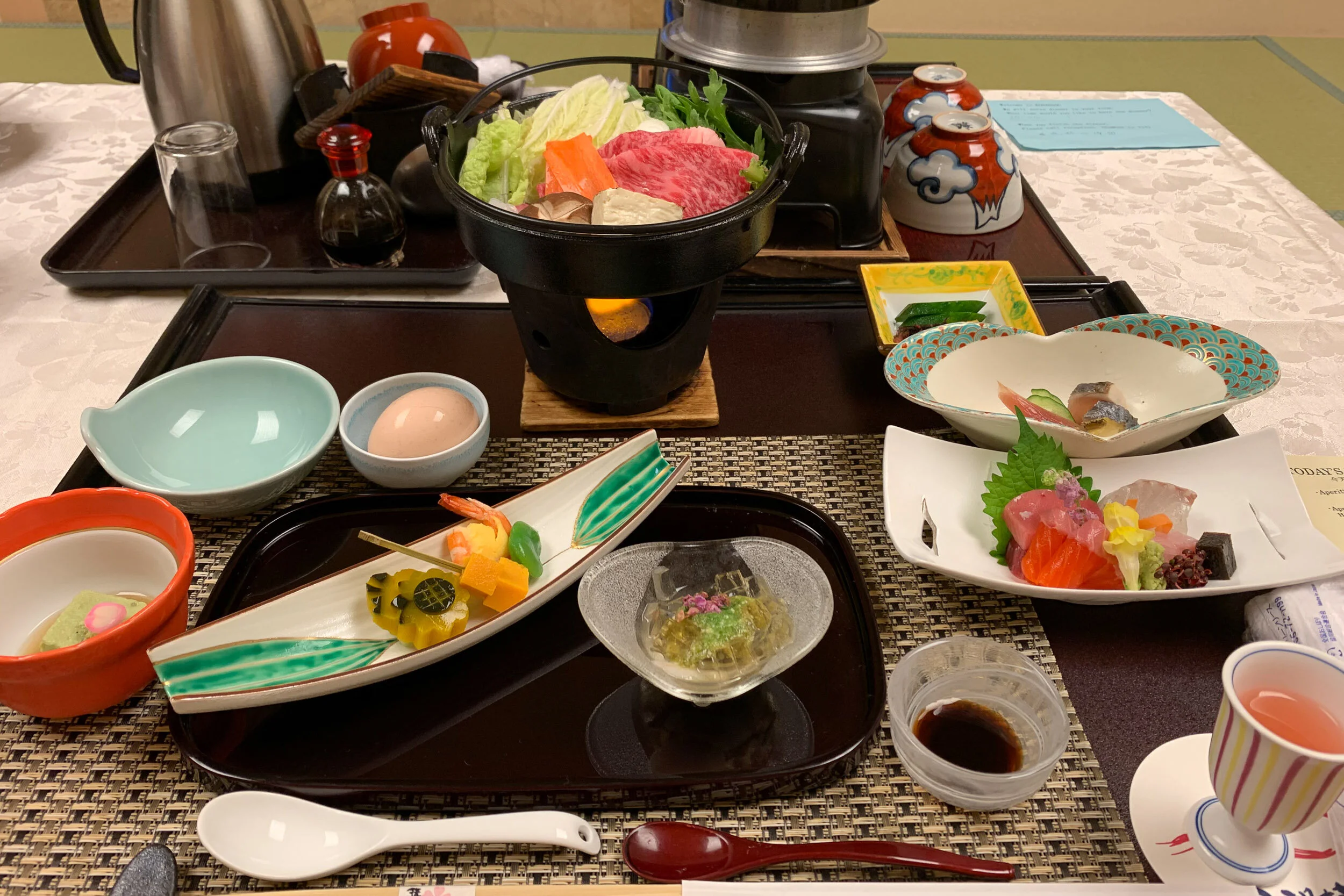 Accompanying our traditional Japanese-style room is kaiseki: traditional multi-course Japanese dinner. It was served right in the room, and it features many exquisitely done dishes. The individual portions may be small, but you’ll still be properly full by the end because there’s so many plates.